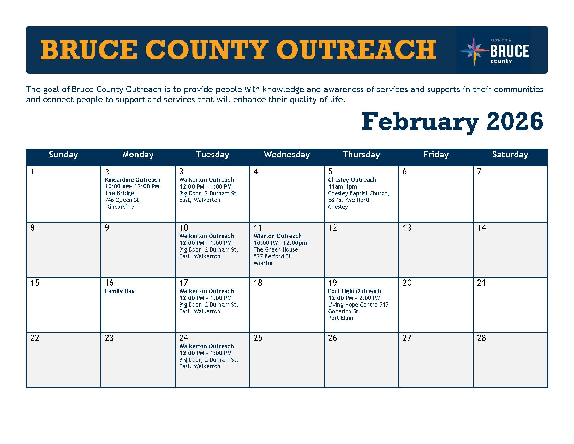 Bruce County Outreach – February 2026 January 15, 2026 by United Way Previous Next Return to Bruce County Outreach