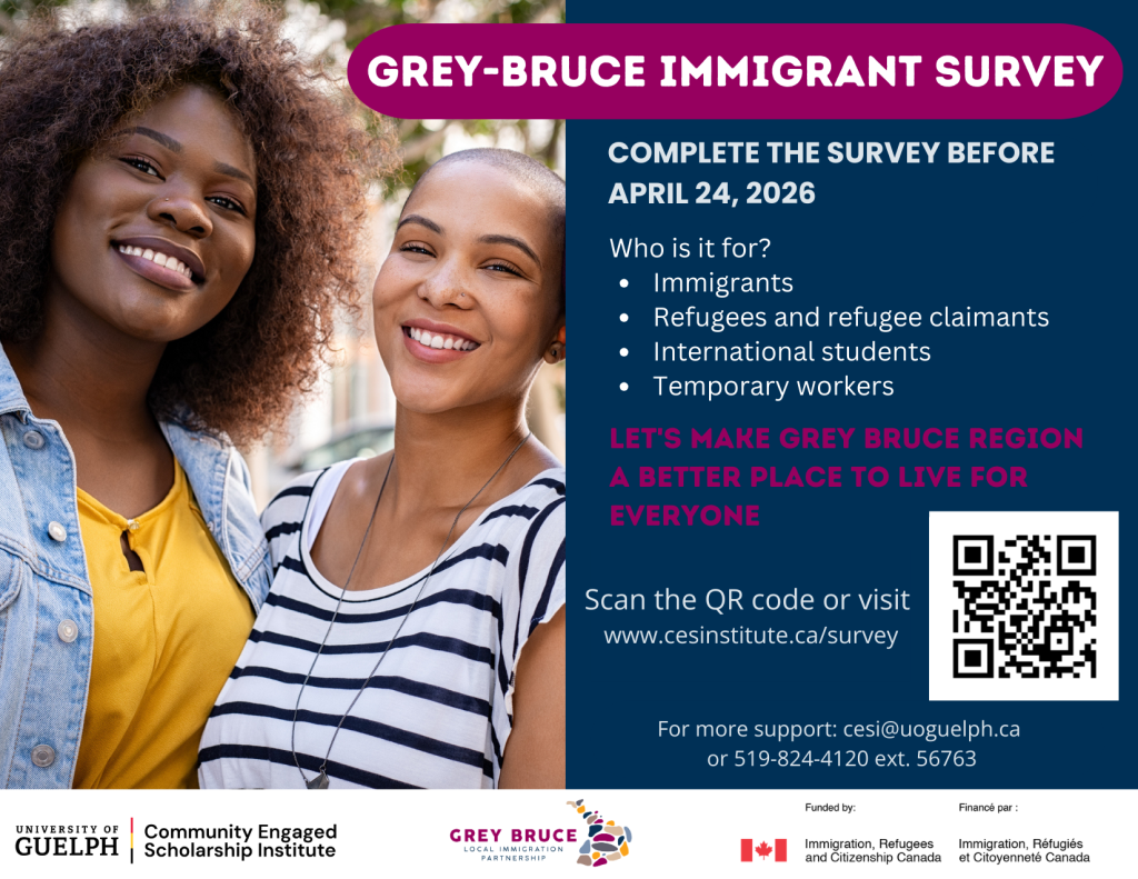 The Grey-Bruce Immigrant Survey 2026 is for immigrants, refugees, claimants, international students, temporary workers and their families to share their experiences of living, working or studying in Grey-Bruce Region. This survey seeks to hear directly from immigrants about their experiences, struggles, the diverse strengths they bring and contribute, as well as their suggestions for how to improve settlement and integration in Grey-Bruce Region.