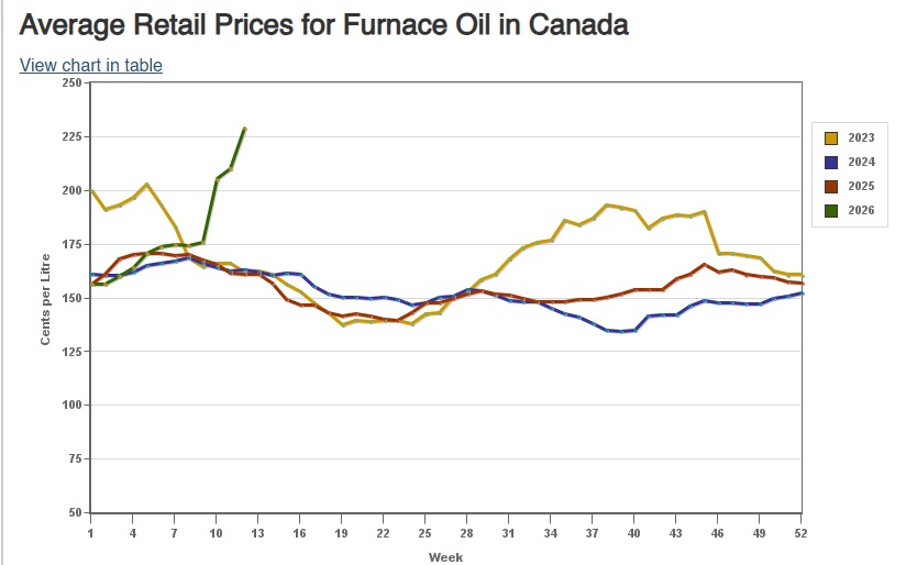 This graph shows the vertical price jump of furnace oil in Canada. From $1.60 per liter at the end of January to $2.29 per litre in mid-March. That’s a 43% increase! The United Way’s grant of $700 would purchase 437.5 litres in January, but only 305 in March, and that’s not including the taxes.